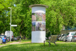 Installed on an advertising column near Freiburg-Wiehre railway station WALK WALK WALK WALK presents 14 large-format posters. Captured over years, the smartphone photographs record moments that contrast with idyllic narratives: traces of industrial agriculture, altered ecosystems, and infrastructural elements that coexist with, or interrupt, the natural land- scape. Alongside these visible marks, the images also follow quieter, everyday signs of change— subtle shifts that may escape the casual observer.